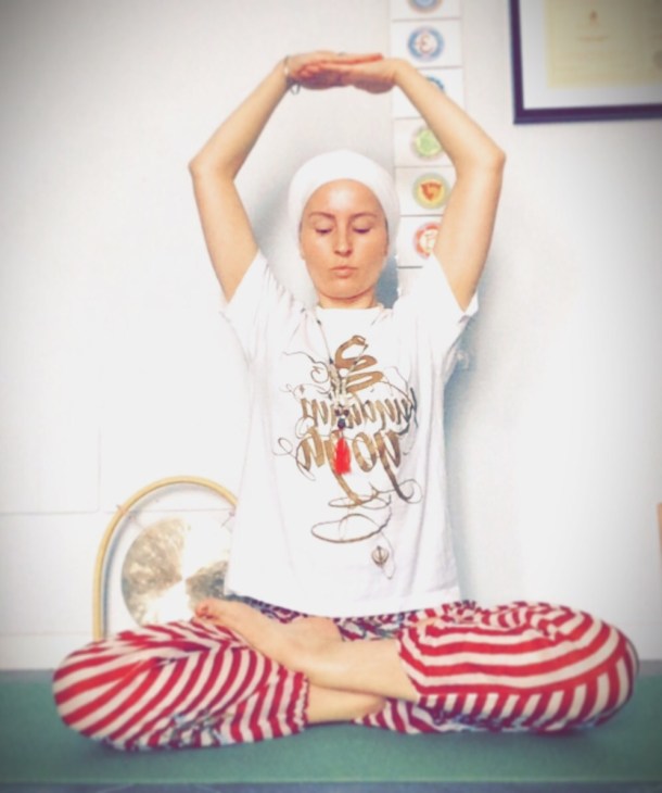 Siedi a gambe incrociate in posizione comoda o su una sedia con la spina dorsale eretta. Solleva le braccia al di sopra della testa, le mani una sull’altra con i palmi rivolti verso il basso. Se sei uomo, poggia il palmo destro sopra il dorso sinistro. Se sei donna, poggia il palmo sinistro sopra il dorso destro. Le punte dei pollici sono unite, i pollici rivolti all’indietro. Le braccia sono lievemente flesse all’altezza dei gomiti. Con gli occhi leggermente aperti, guarda verso il labbro superiore e sussurra il mantra “Wa-he Gu-ru”. Durata: 3 minuti.